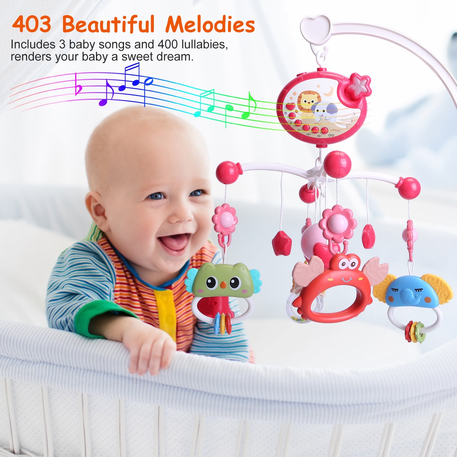 *Music Box With Night Light*:This musical mobile bed bell has a soft night light. Come with 3 baby songs and 400 midi lullabies. Volume adjustable suits for different needs of baby’s sleep.